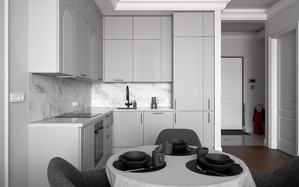 С барной стойкой — для современных интерьеров. Заменяет обеденный стол, экономит место. Подходит для быстрых перекусов и встреч. Хорошо вписывается в студии и открытые планировки.