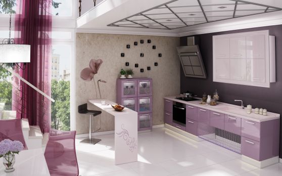 Белая кухня в фиолетовом интерьере
