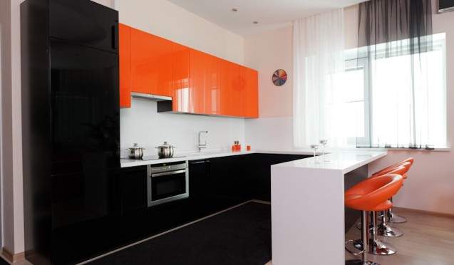 Черный глянец выглядит особенно изысканно и стильно. Подобную расцветку рекомендуется использовать в просторных помещениях, расположенных на южной стороне. Для оформления черных поверхностей используются стальные элементы лаконичной формы.