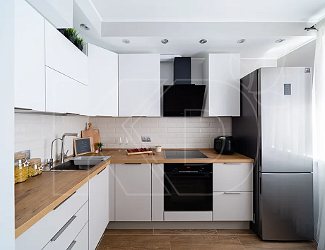 • Угловая. Это самое распространенное решение. Угловая кухня позволяет грамотно разместить рабочую зону и места для хранения таким образом, чтобы хозяйке было удобно перемещаться по комнате.