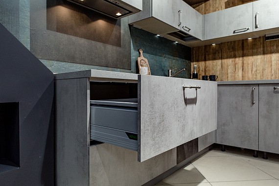 Это еще одна конфигурация, на которую стоит обратить внимание тем, кто решил купить узкую кухню в Москве. Если в конце пространства нет окна и батареи, то угловая расстановка – это отличное решение. В рамках нее гарнитур размещают в конце помещения вместе с мойкой и холодильником. Это позволяет освободить максимум пространства в начале комнаты и в центре. На свободной территории можно поставить обеденный стол, диван, шкаф-пенал или другую мебель.