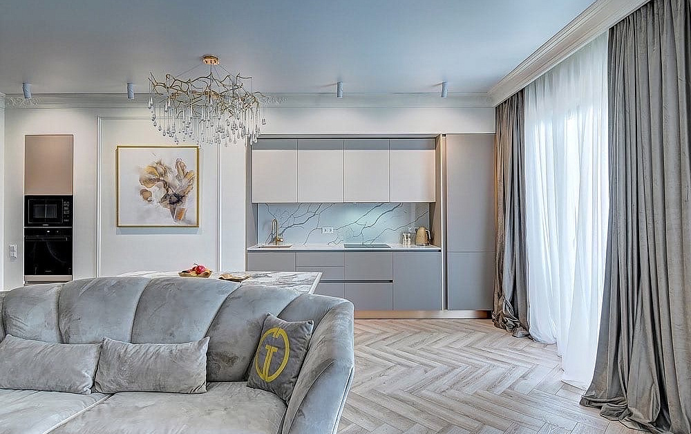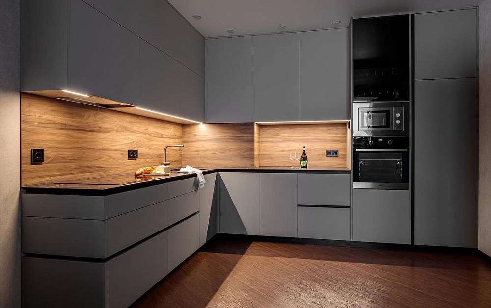 Данное правило в первую очередь касается параллельной и П-образной планировки. Для свободного перемещения между модулями потребуется расстояние 1,2-1,5 метра. В противном случае будет неудобно открывать дверцы шкафов и духовок.