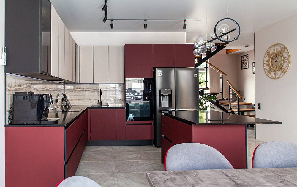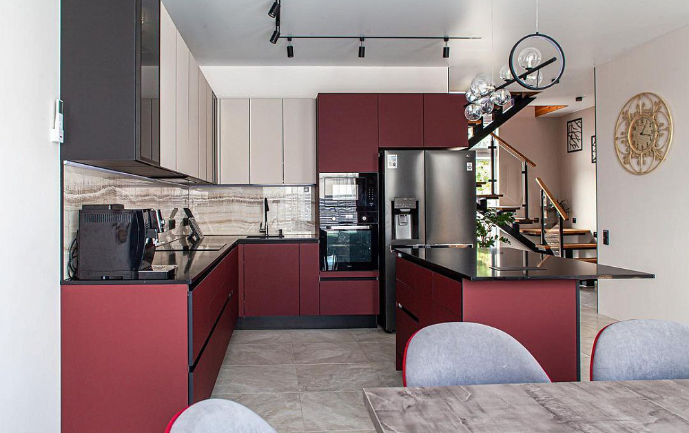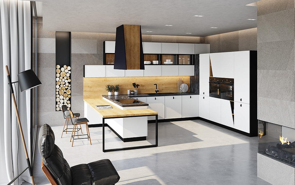 В больших помещениях кухня и гостиная часто оказываются совмещенными. Визуально отделить одну зону от другой можно с помощью островной конструкции, барной стойки или стеллажа. Зонирование с помощью кухни на заказ от производителя технически выполнить гораздо проще. Дело в том, что комплект будет изготовлен с учетом архитектуры пространства.