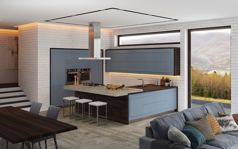 Для квартир-студий, частных домов и дач идеально подходят островные модели. Дополнительная конструкция может использоваться в качестве обеденного стола, а также для зонирования пространства.