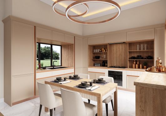 Для больших комнат подходят П-образные, островные и двухрядные версии. Расцветка и декоративная отделка моделей может быть любой, так как большая площадь позволяет дать волю фантазии.