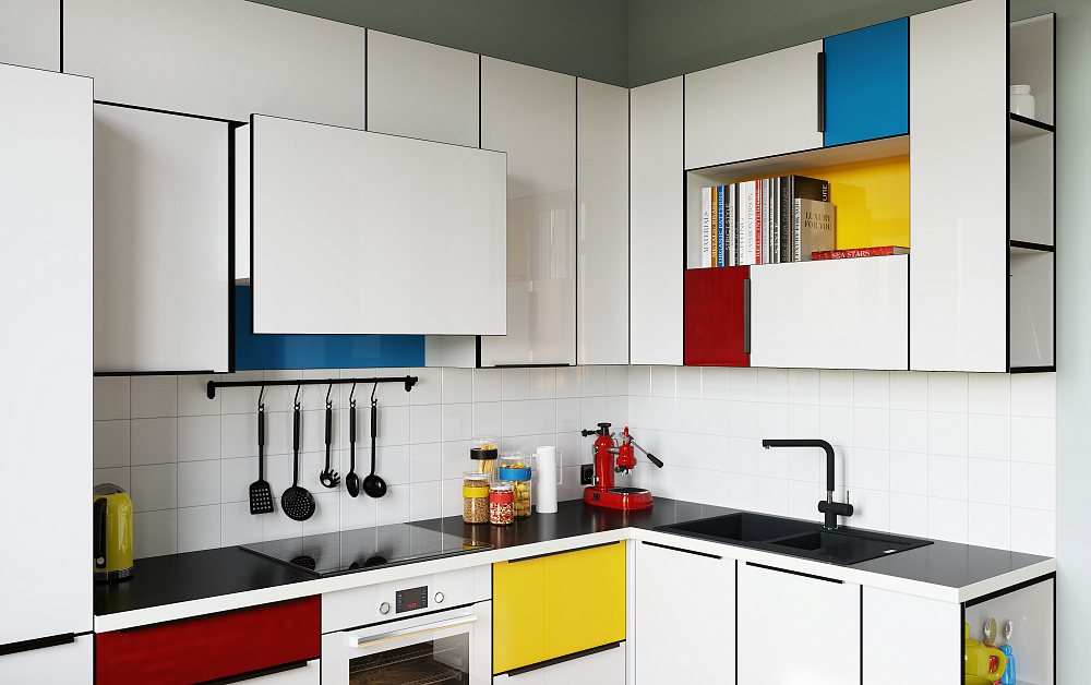 - кухонный гарнитур с контрастными решениями, фигурными вставками на дверцах и раздвижных створках;