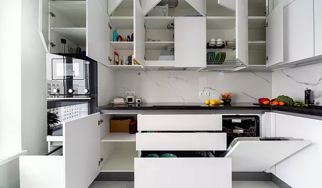 Вы можете заказать кухню по индивидуальным размерам из разборных модулей ДСП, но когда начнете собирать ее после переезда, то вам придется заняться сверлением новых отверстий, потому что материал рассыхается и вздувается во влажной среде. Гарнитур из ДСП прослужит вам всего лишь четыре года или немного больше.