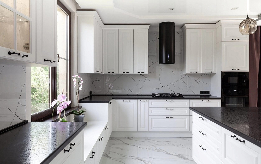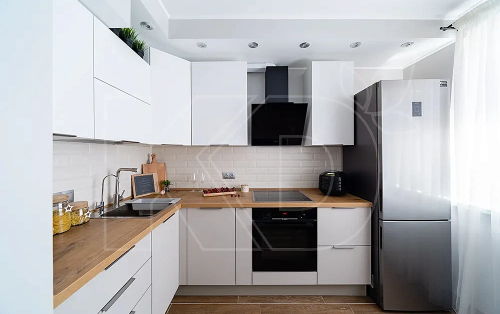 В средних по размеру помещениях часто устанавливают угловые кухни. В белом цвете они выглядят особенно эффектно, потому что не перегружают комнату. При такой планировке в свободный угол обычно встраивают шкаф для посуды и мойку.