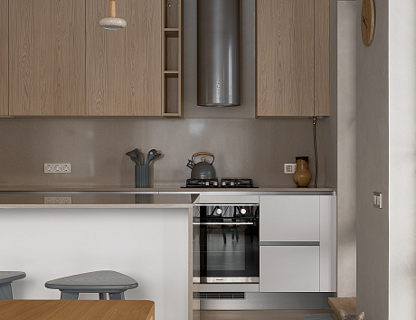 Геометрия кухни безупречна: прямые линии, вписанные в нишу, создают ощущение архитектурного абсолюта. Но истинное «сердце» пространства — монументальный остров. Его столешница в оттенке капучино напоминает гладкий речной камень, отшлифованный временем. Это многоликое пространство: утром — алтарь для кофе и тихих раздумий, днем — профессиональный цех кулинарного искусства, а вечером — место силы, где за бокалом аперитива рождаются самые важные семейные истории.