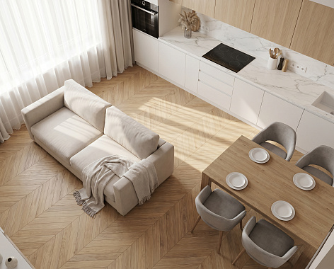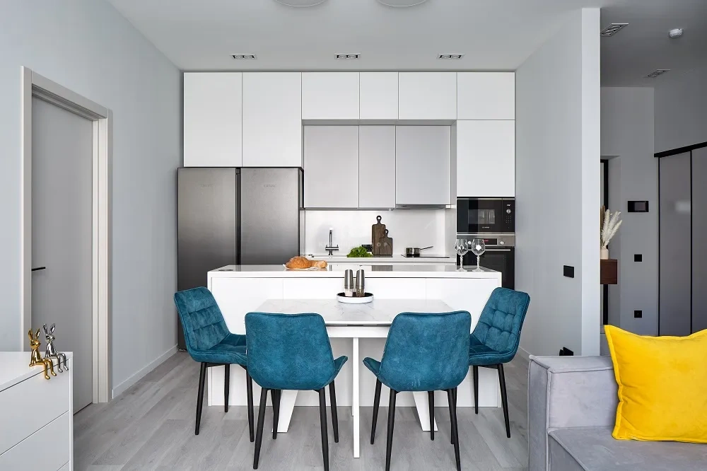В больших квартирах часто объединяют кухню с обеденной или гостиной зоной, чтобы пространство выглядело свободнее и светлее. Диван, мягкие кресла или полноценная столовая группа помогают создать уютный уголок для отдыха, семейных ужинов и общения с друзьями, превращая кухню в настоящее сердце дома.