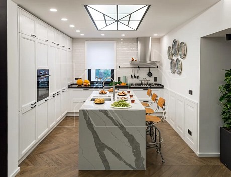 При выборе светлого гарнитура с островом предпочтение следует отдать моделям с простыми формами без лишнего декора. Такая мебель смотрится в пространстве более гармонично, не перегружая его.