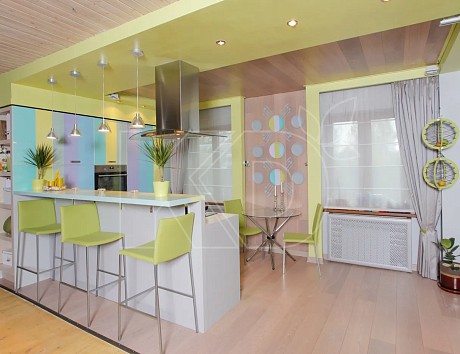 При этом нижний блок лучше выполнить в темно-зеленом цвете, а верхний – в нейтральном белом. Подчеркнуть свежесть поможет светлая столешница. Еще один цвет можно ввести в качестве акцента. Это может быть какой-то из элементов декора, например, ярко-желтый.