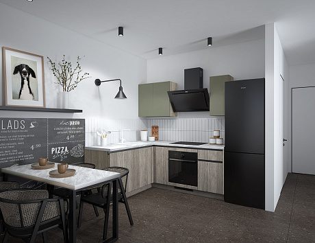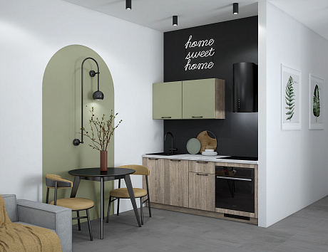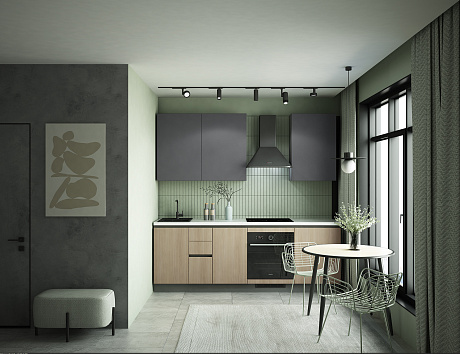 Несмотря на компактные размеры, Уна предлагает максимум удобства: антресольные шкафы увеличивают объём хранения, сохраняя визуальную лёгкость. Фасады мы изготовили из прочной экоплиты EGGER — качественного материала, устойчивого к воздействию влаги и механическим повреждениям. Все элементы продуманы до мелочей, чтобы кухня оставалась эргономичной, удобной и приятной в использовании на многие годы.