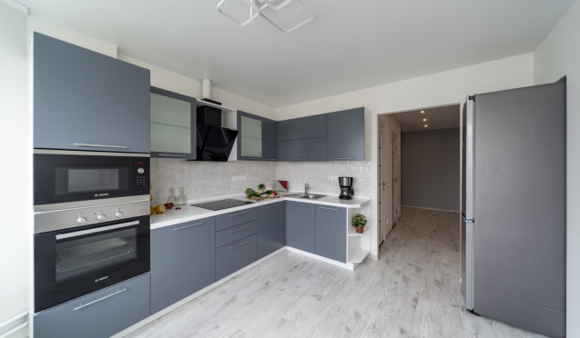 Освещение также имеет важное значение в подборе отделки для кухни серого цвета: если естественного освещения недостаточно, большую часть пространство рекомендуется оформлять в бледных тонах.