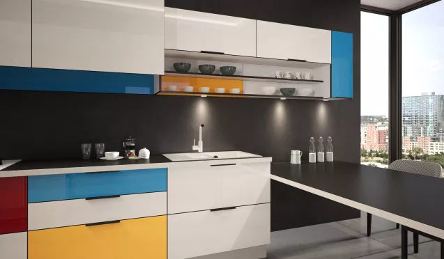 Практичность. Фасады кухни в желтых цветах легко очищаются от загрязнений с помощью мягкой губки и обычного моющего средства.