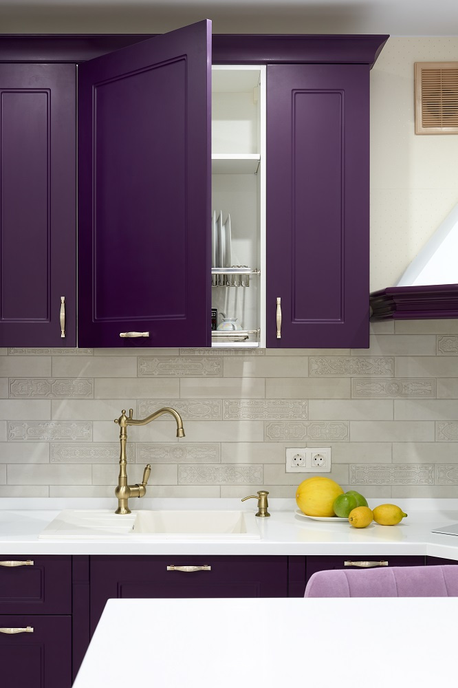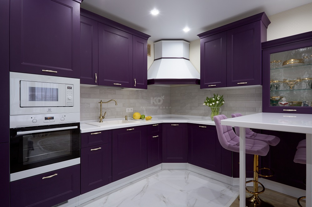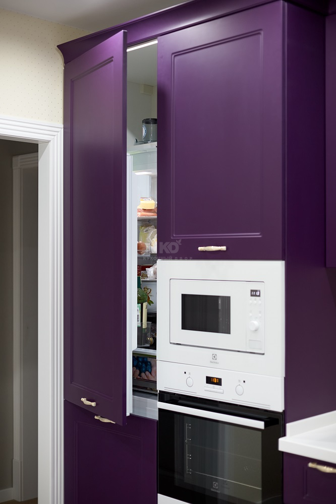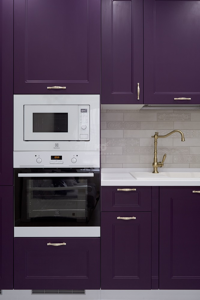 С первого взгляда видно, что классические интерьеры – родная стихия для «Эрики». Величественные шкафы верхнего яруса здесь увенчаны элегантными карнизами, массивная трапециевидная вытяжка имеет стильный бандаж, а на фасадах из МДФ присутствуют изящные ручки и прямоугольная фрезеровка. Фасады, к слову, имеют «дышащее» покрытие – экомембрану, которая обеспечивает надёжную защиту и надолго сохраняет первозданный насыщенный цвет. Добавив ко всей этой красоте ультрасовременное техническое оснащение, мы получили не просто кухню, а восхитительный образец неоклассического стиля!