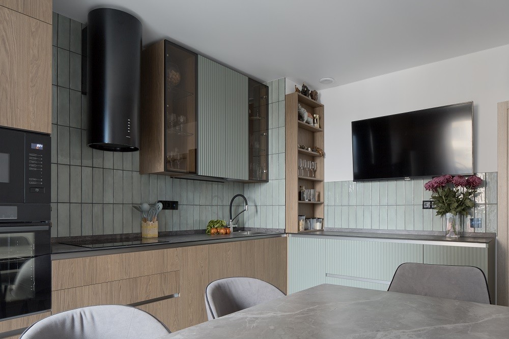 Явные отсылки к «Стоун Вуд» можно заметить, разглядывая фасады. Они выполнены из экоплиты, которая искусно имитирует внешний вид и текстуру натуральной древесины и воплощает первозданную красоту природных материалов. В сочетании с оливковыми деталями кухня выглядит по-настоящему изысканно и натурально, максимально отражая основные черты экостиля. Фасады оснащены инновационной системой открывания без ручек с Интегрированным профилем (Space Line), делающей образ монолитным и завершенным. Это – один из реверансов модели «Стоун Вуд + Джейн Вертикаль» в сторону функциональных решений.