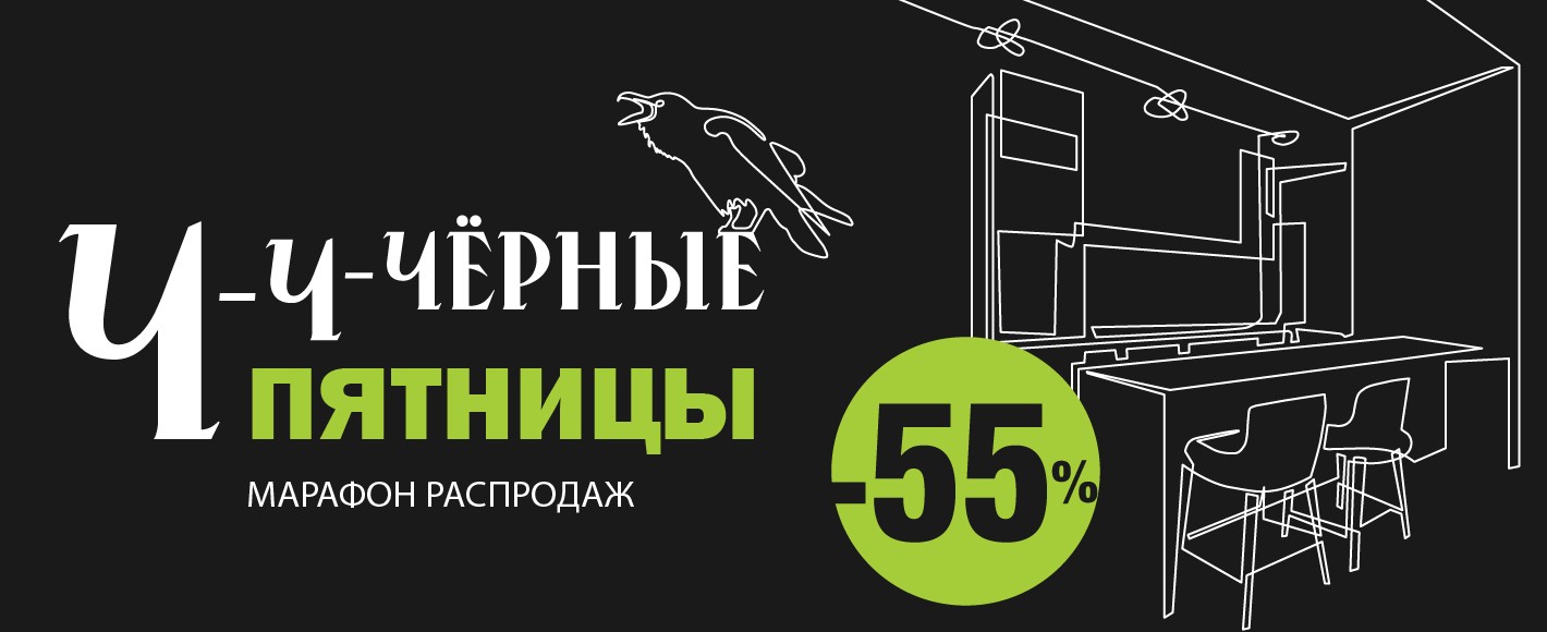 Объявляем старт самой долгожданной распродажи в году — Чёрной пятницы. Скидки до 55% на кухни* по индивидуальному заказу и из сертифицированных материалов. Не откладывайте на потом — Чёрная пятница не бесконечна. Пора действовать: выберите свою кухню сегодня и сэкономьте по максимуму завтра.