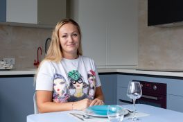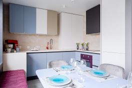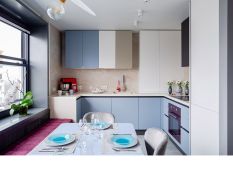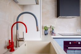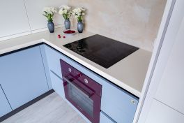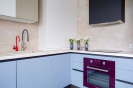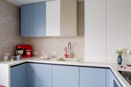 Кухня получилась «воздушной», но, вместе с тем, притягательной. За лёгкость здесь отвечает бархат фасадов и их нежная цветовая палитра. А притягательные акценты умело выставлены с помощью техники! Взгляните, в каких сочных цветах выполнены фильтр для воды, духовой шкаф и миксер! Словно яркие штрихи на монохромном полотне они попадают точно в фокус Вашего внимания. И помогают при этом постичь глубину всей композиции!