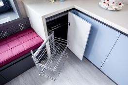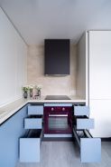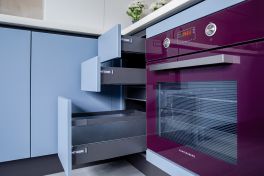 В зависимости от типа фасадов, для их открывания используются две системы – «Tip-On» и «Space Line». Первая отлично подходит для фасадов верхнего яруса и не нарушает их монолитность. А вторая подчёркивает контуры кухни и создаёт иллюзию «парящей» столешницы. Кстати, рабочая поверхность и корпус выполнены в одном цвете, поэтому кажется, будто столешница «ниспадает» на пол. Выглядит очень эффектно, особенно в сочетании со «Space Line» и графитовыми цоколями!